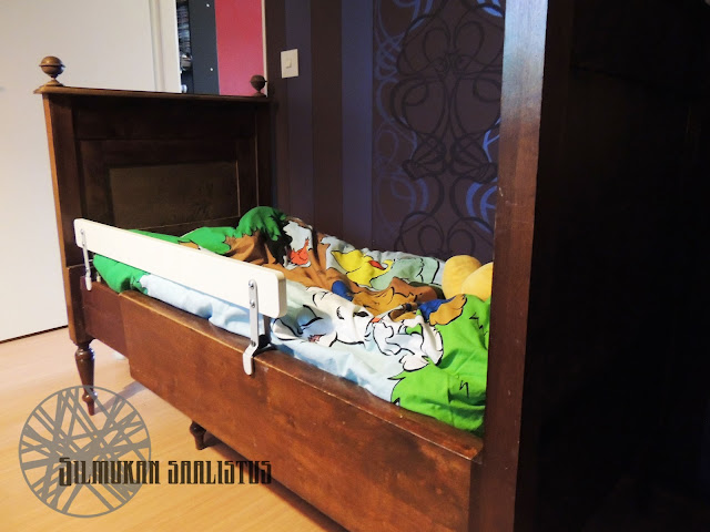 Mutta asiaan. Pikku-E:n tämänhetkinen sänky on vanha, suvussamme kulkeutunut päästävedettävä sänky. Se on peräisin 1900-luvun alusta, tai jopa kauempaa historiasta. Tästä tulee mieleen isän isän äitini koti, jossa sänky sijaitsi, kun olin lapsi. Sängynpääty on täynnä kauniita yksityiskohtia. Ja löytyyhän sieltä pieniä pinnojakin, joten jotain tuttuakin pitäisi olla. Sänkyyn laitettiin varmuuden vuoksi lisäreuna mallia Ikea, jota ei tarvinnut kiinnittää ruuveilla. Lisäreunan toinen rauta tarvitsee vielä muotoilla uudestaan, jotta se saadaan sängyn isompaan päätyyn kiinni.